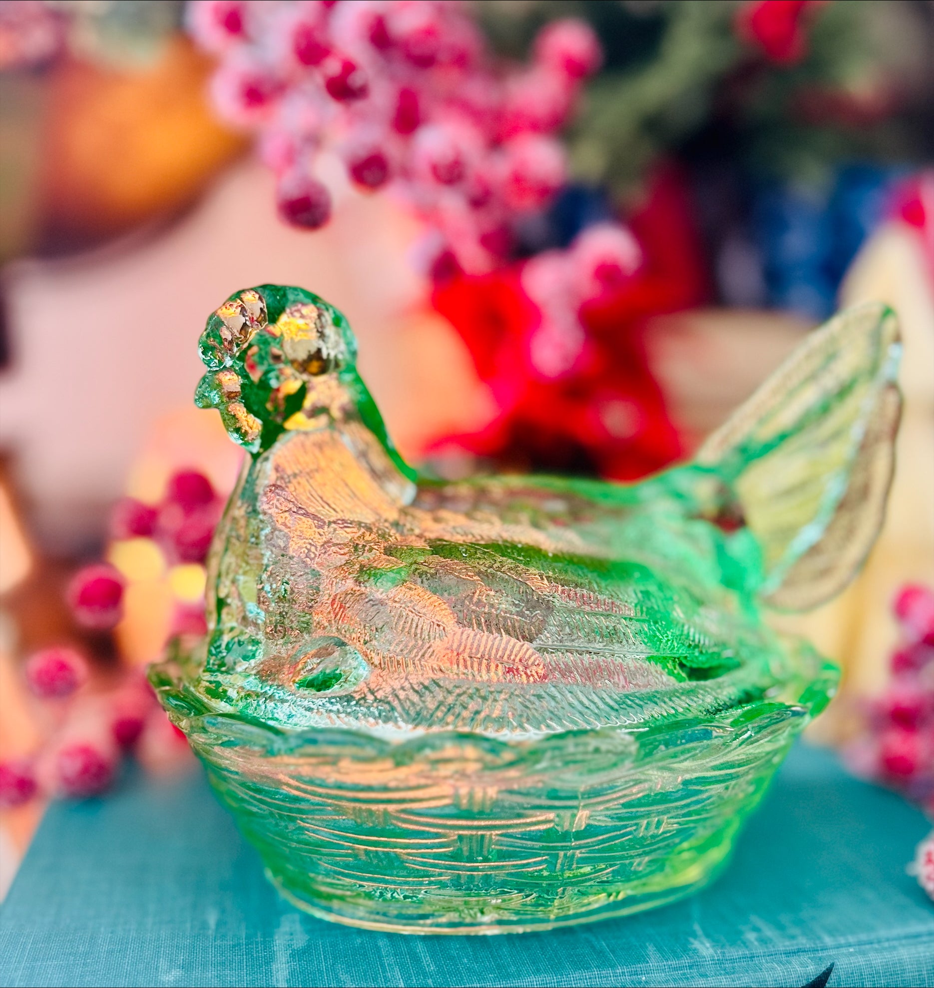 6 inch Green Glass Hen on Nest Classic Vintage Charm