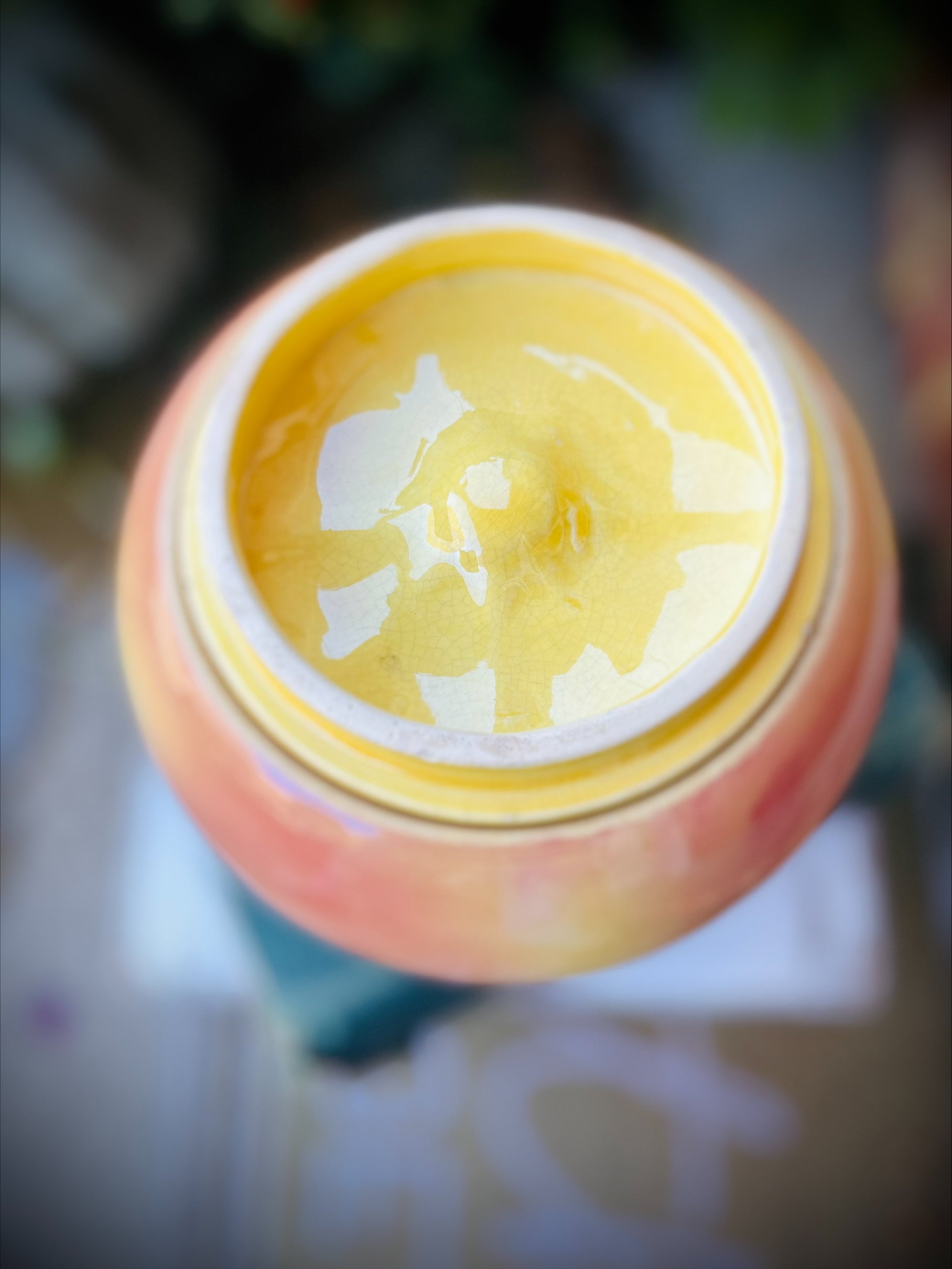 This distinguished McCoy Pottery cookie jar exemplifies mid-century American ceramic artistry with its sculptural apple form rendered in warm crimson and peachy glazes, finished with a glossy green leaf crown. Dimensioned at 8 inches in height and width, it seamlessly transitions between functional storage and decorative display piece. A minor leaf imperfection can be expertly concealed with matching paint restoration. The jar's refined proportions and masterful glaze work make it an authoritative addition to serious pottery collections, period-appropriate farmhouse interiors, and curated vintage kitchen assemblies. An essential acquisition for discerning collectors of authentic American decorative ceramics.