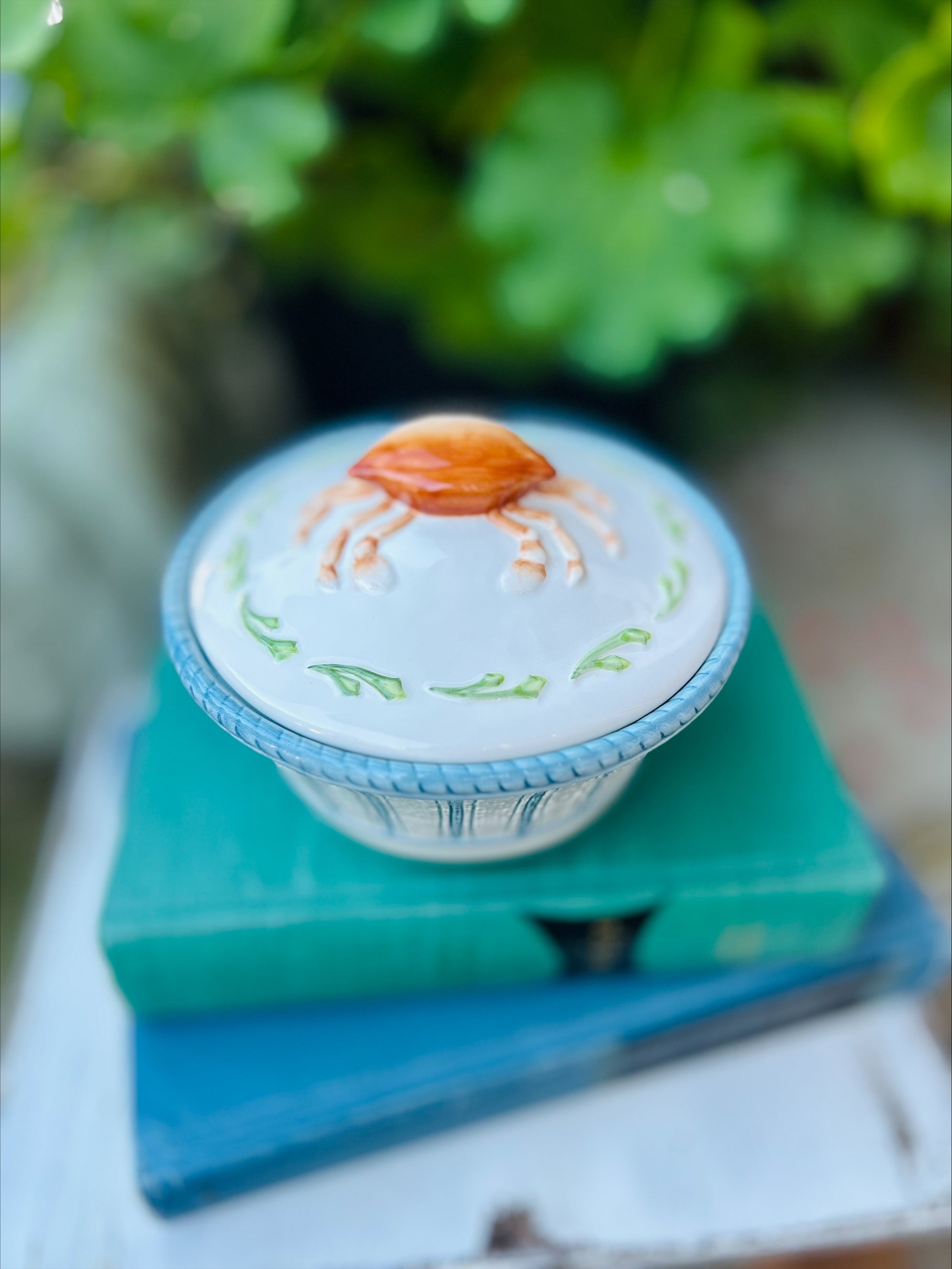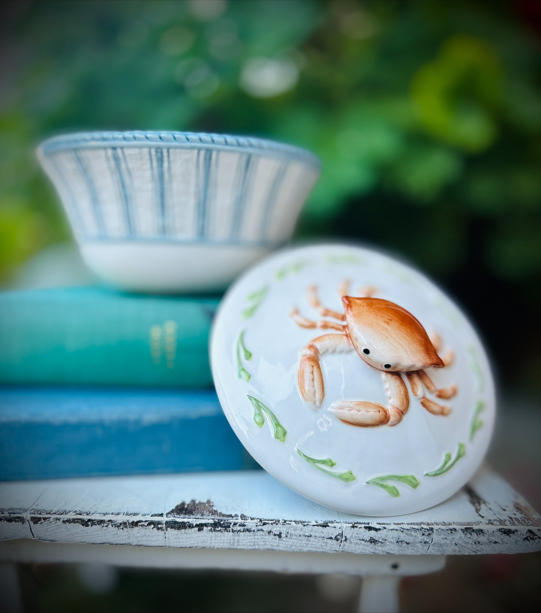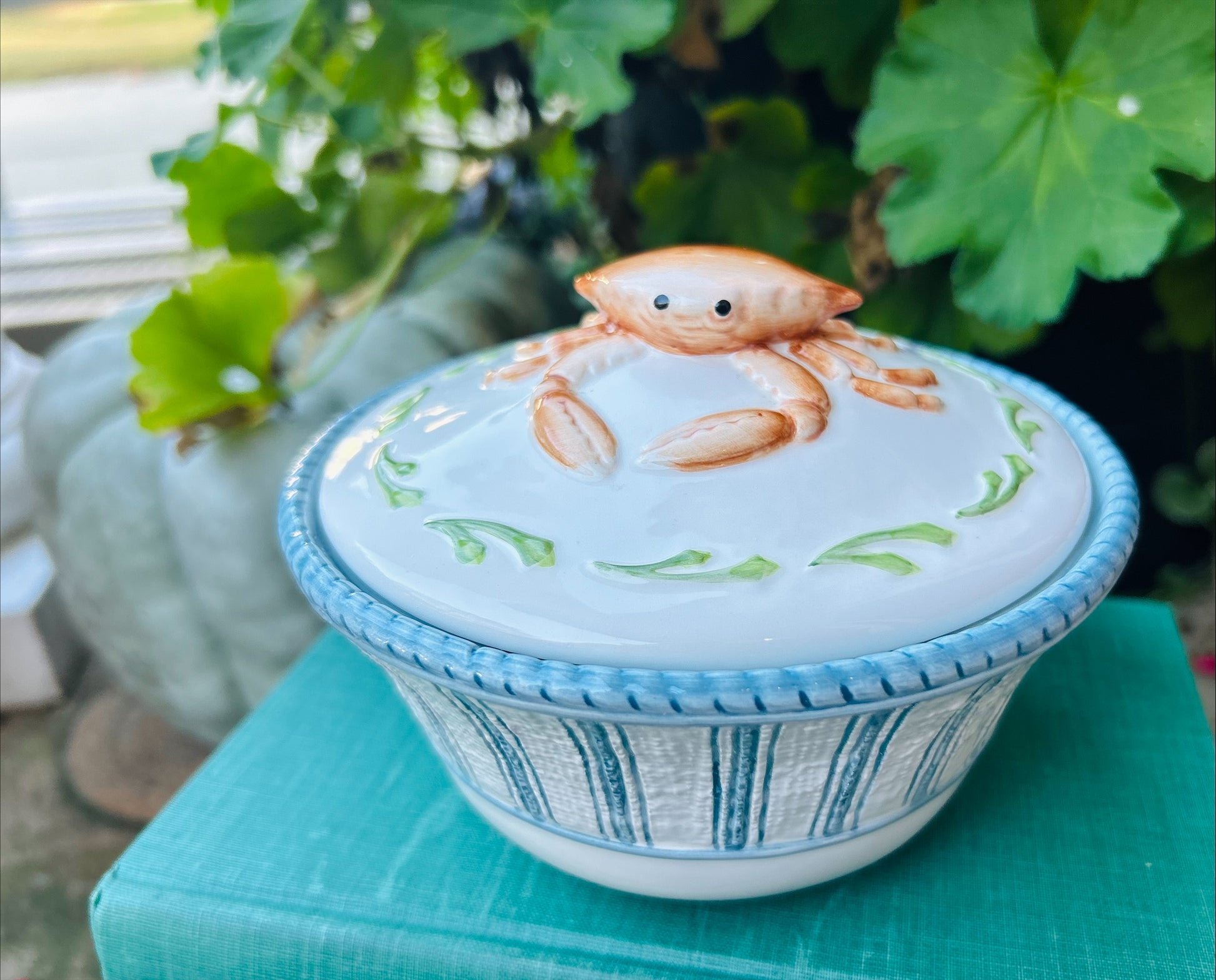 This Fitz and Floyd Classics "Seaboard" bowl exemplifies the brand's renowned craftsmanship with its distinctive crab-shaped lid handle and refined coastal aesthetic. The crisp white ceramic body is accented with soft blue and green detailing, evoking the serene beauty of seaside living. Versatile in function, it serves equally well for presenting salads and fresh fruits or standing alone as an elegant table centerpiece. Measuring 4½ inches tall by 6 inches wide, this collectible piece appeals to discerning Fitz and Floyd enthusiasts and those drawn to artisanal ceramic design. A sophisticated addition for anyone seeking to infuse their home with timeless coastal sophistication.