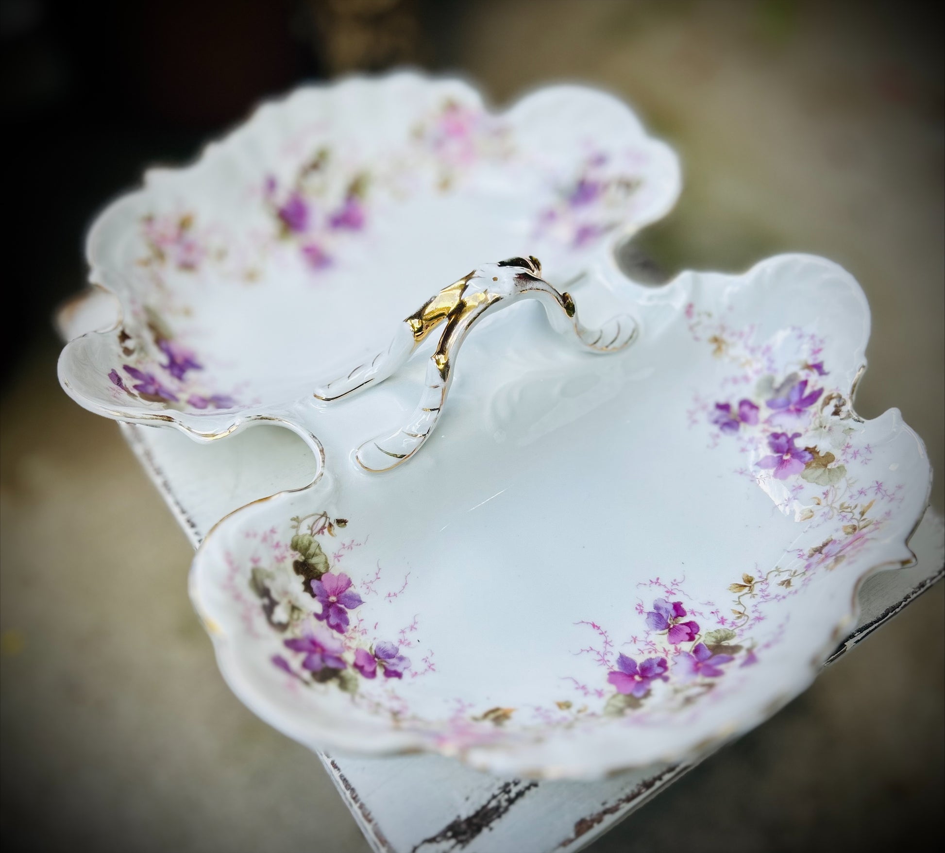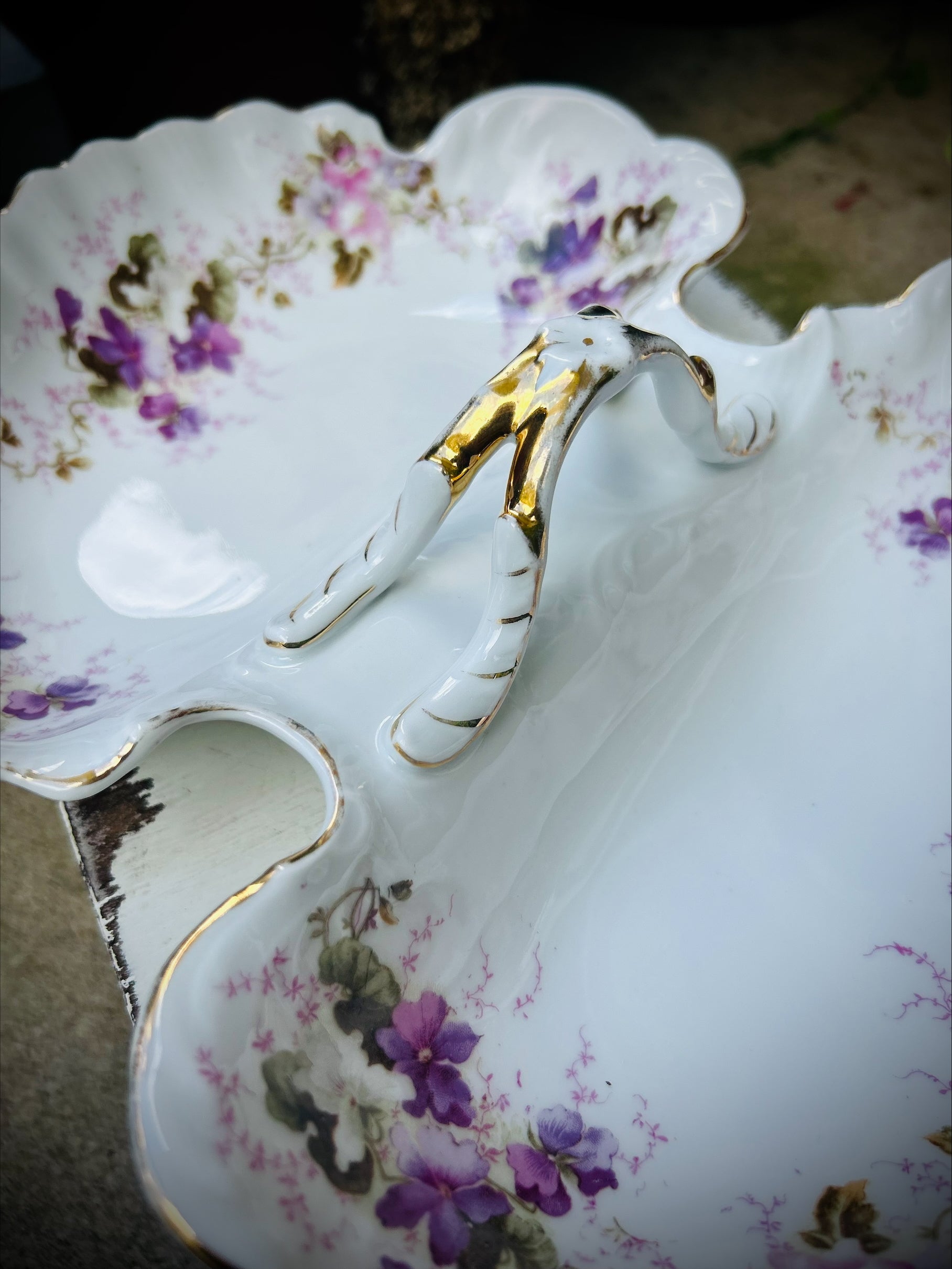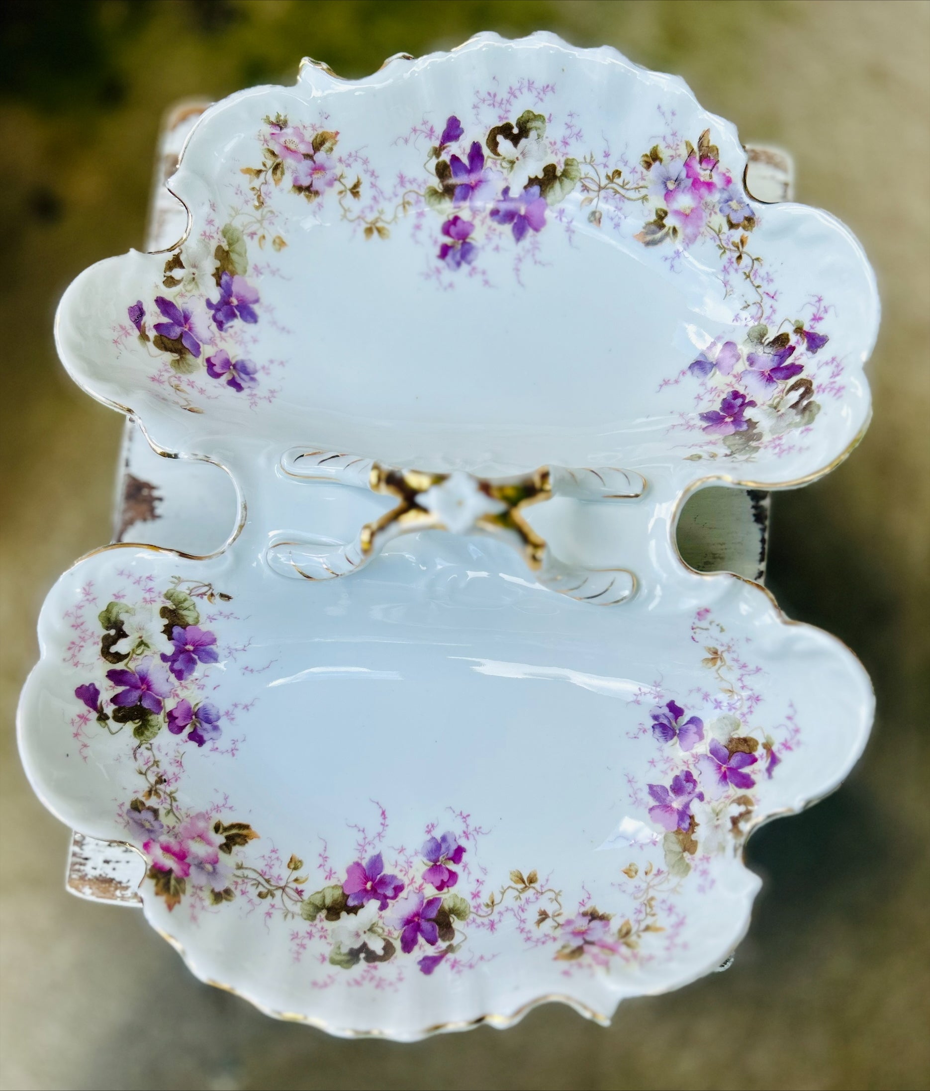 Vintage Divided Vegetable bowl with purple florals, gold rim.