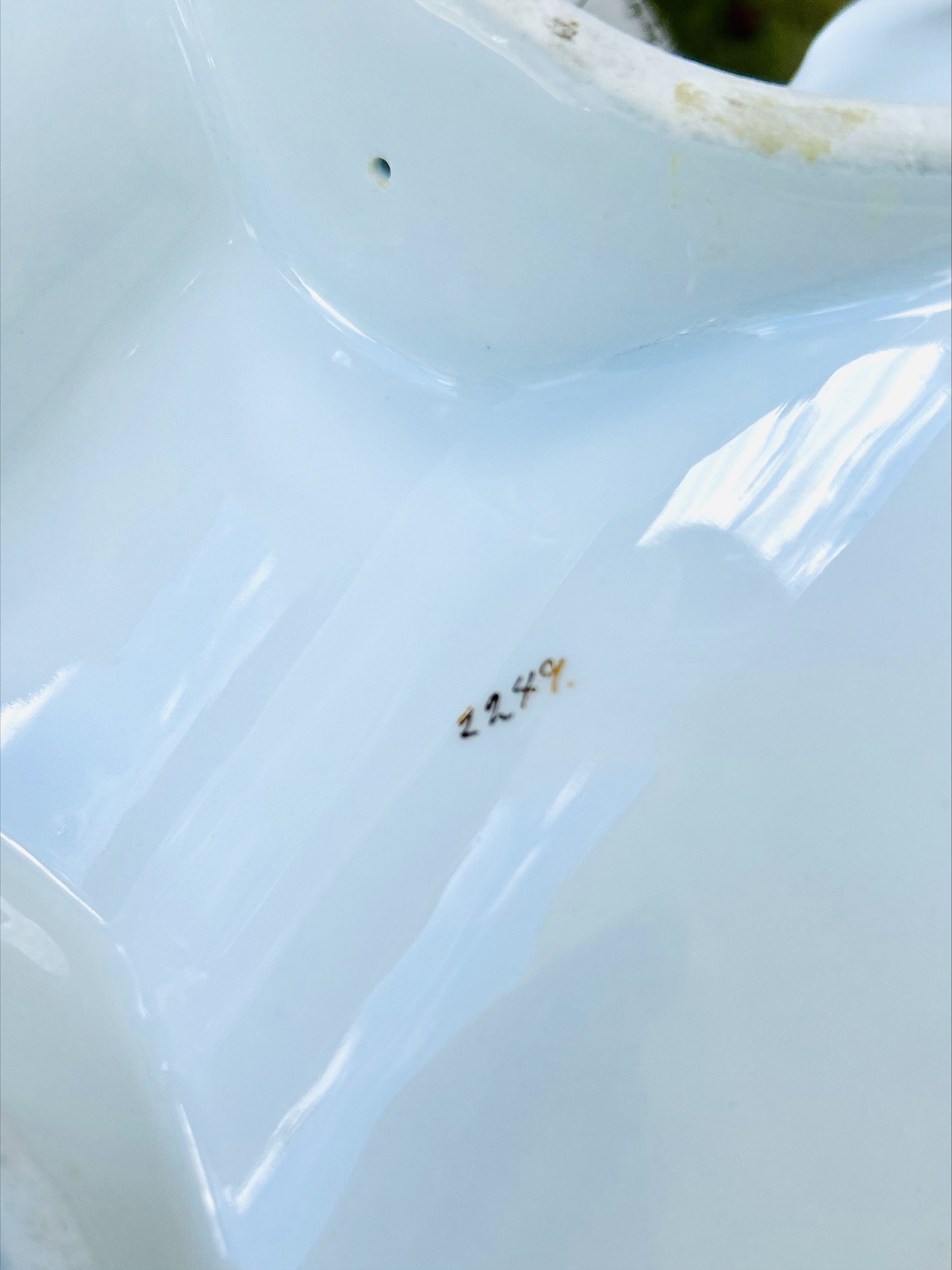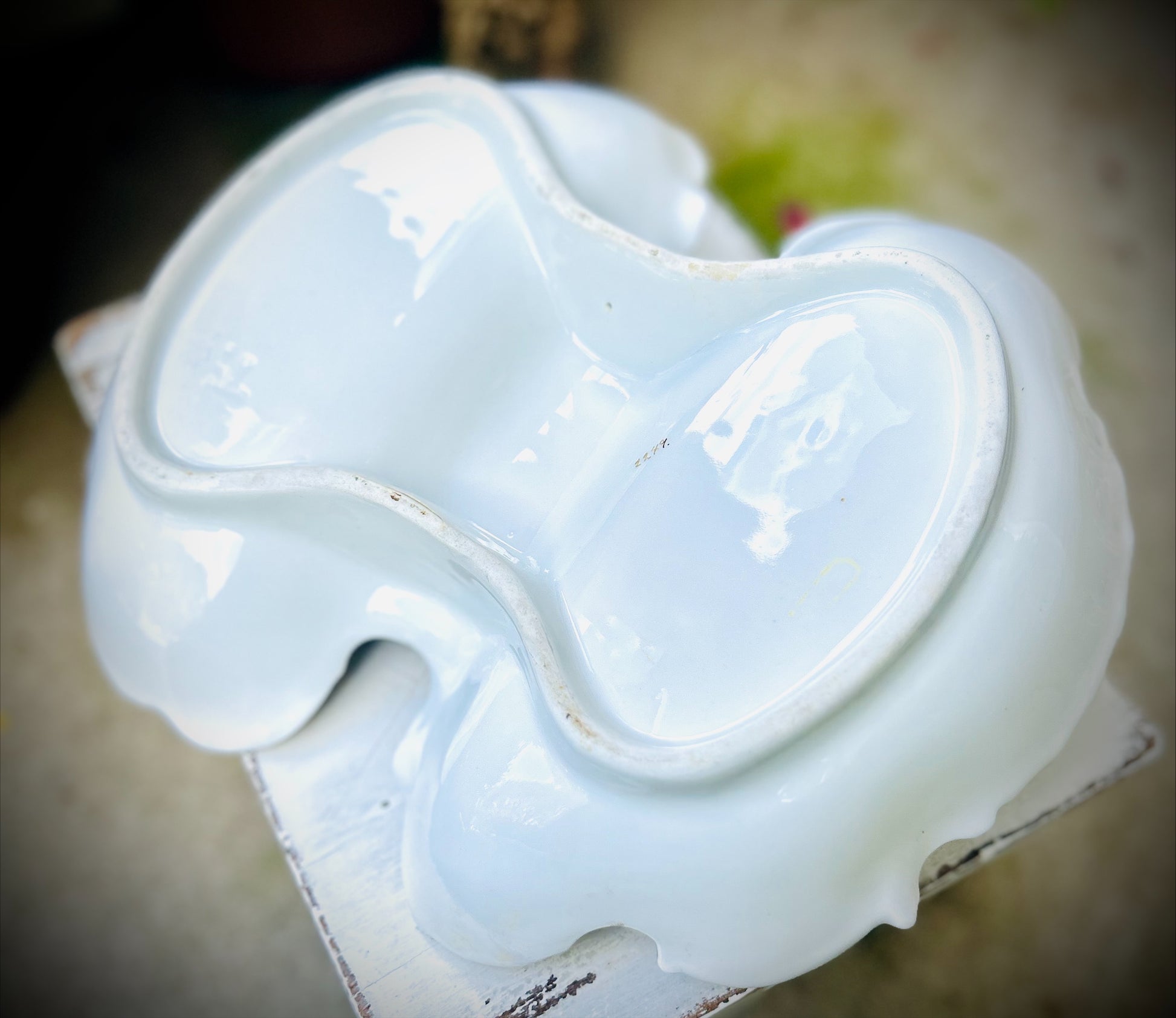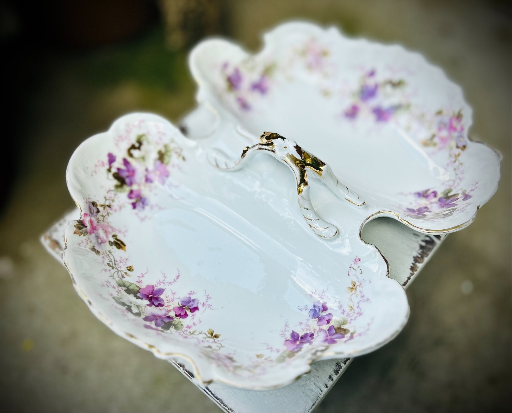 Add a touch of timeless sophistication to your table with this vintage divided porcelain serving dish. It features finely scalloped edges, a delicately hand-applied gold rim, and a central handle, making this two-compartment bowl ideal for presenting vegetables, relishes, candies, or snacks. The elegant floral motif in soft purples and pinks enhances its appeal for entertaining or as a distinguished piece in a vintage china collection. Marked 2249 on the base, this dish exemplifies the refined craftsmanship of mid-century porcelain. Measuring 12 inches wide and 2 1/2 inches deep, it shows minor wear on the gold rim consistent with its age, which does not detract from its aesthetic or functionality.