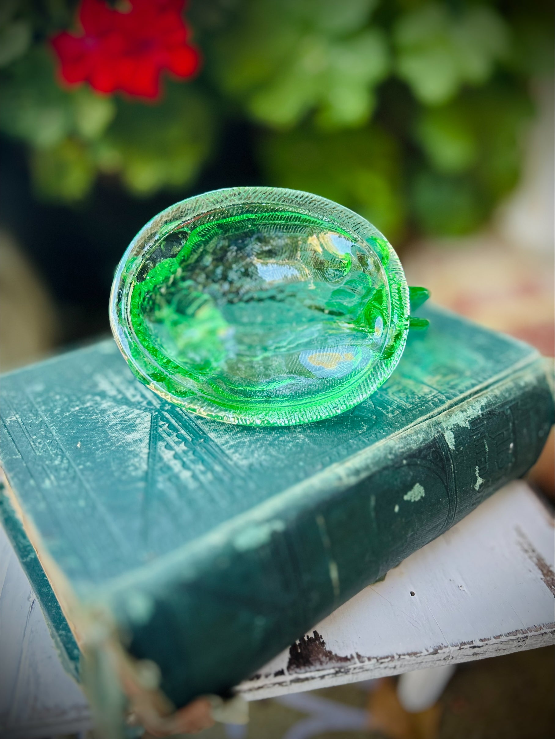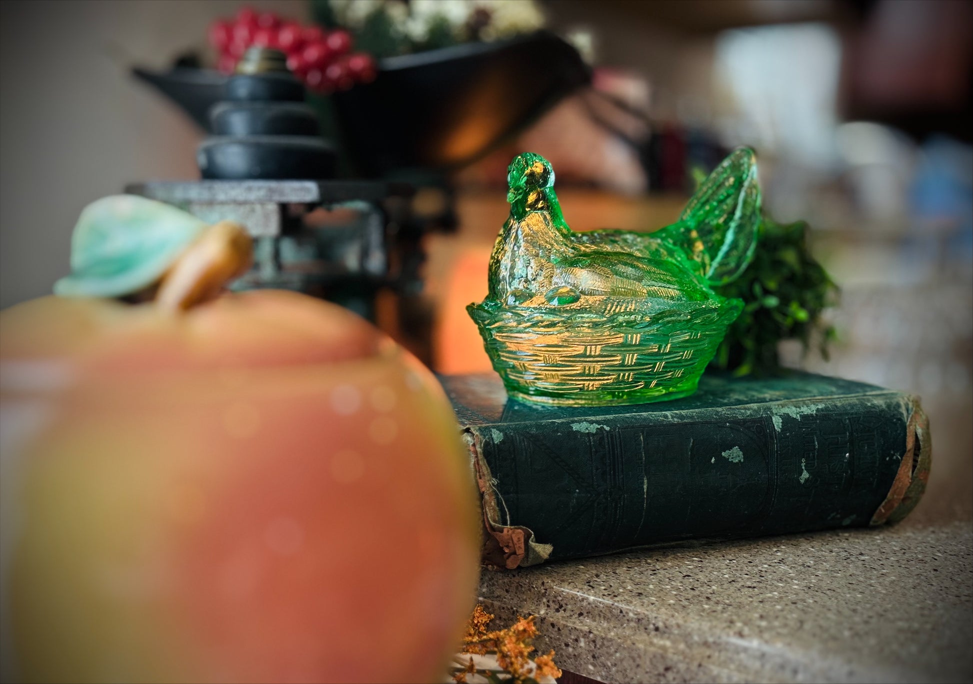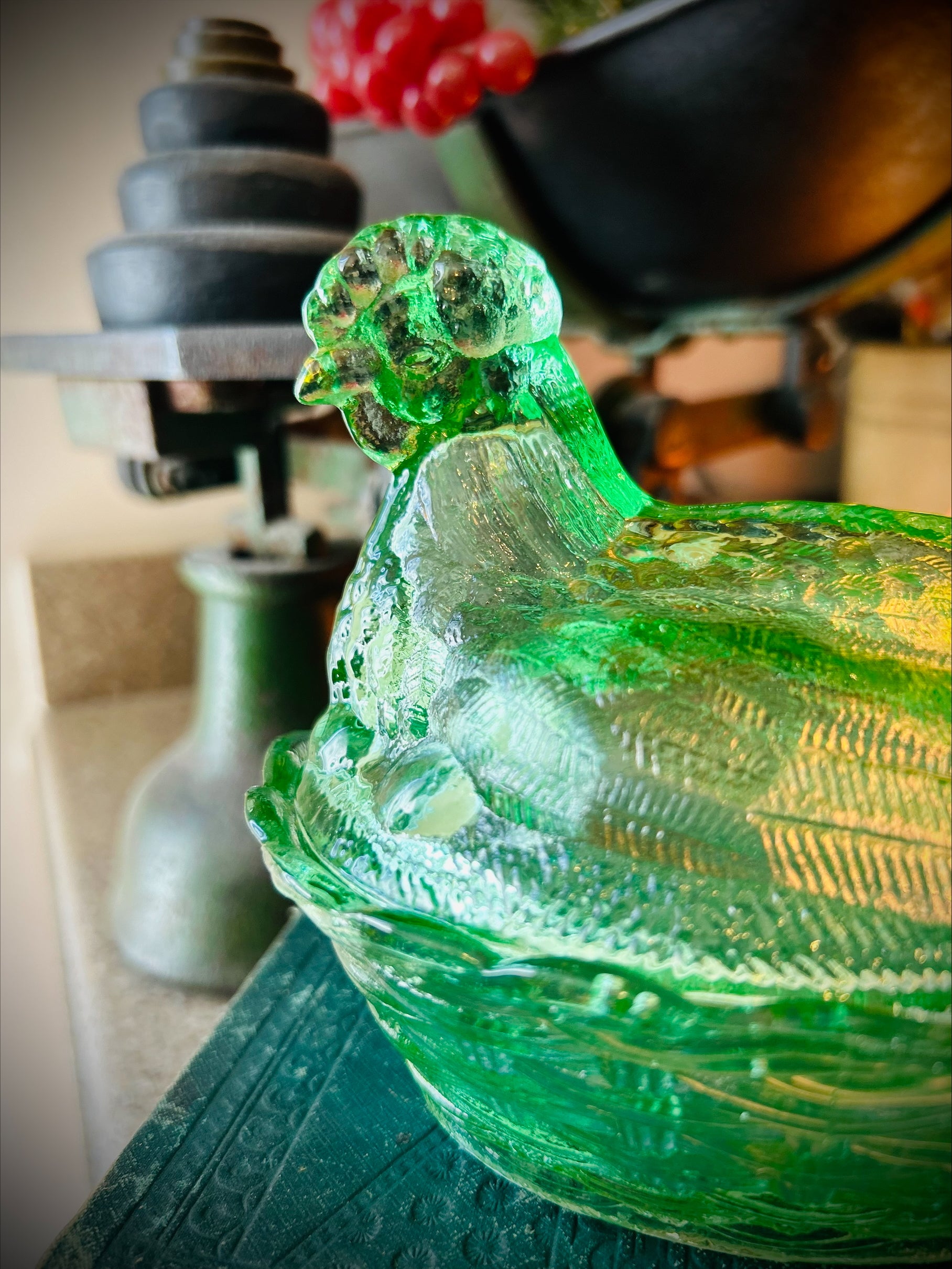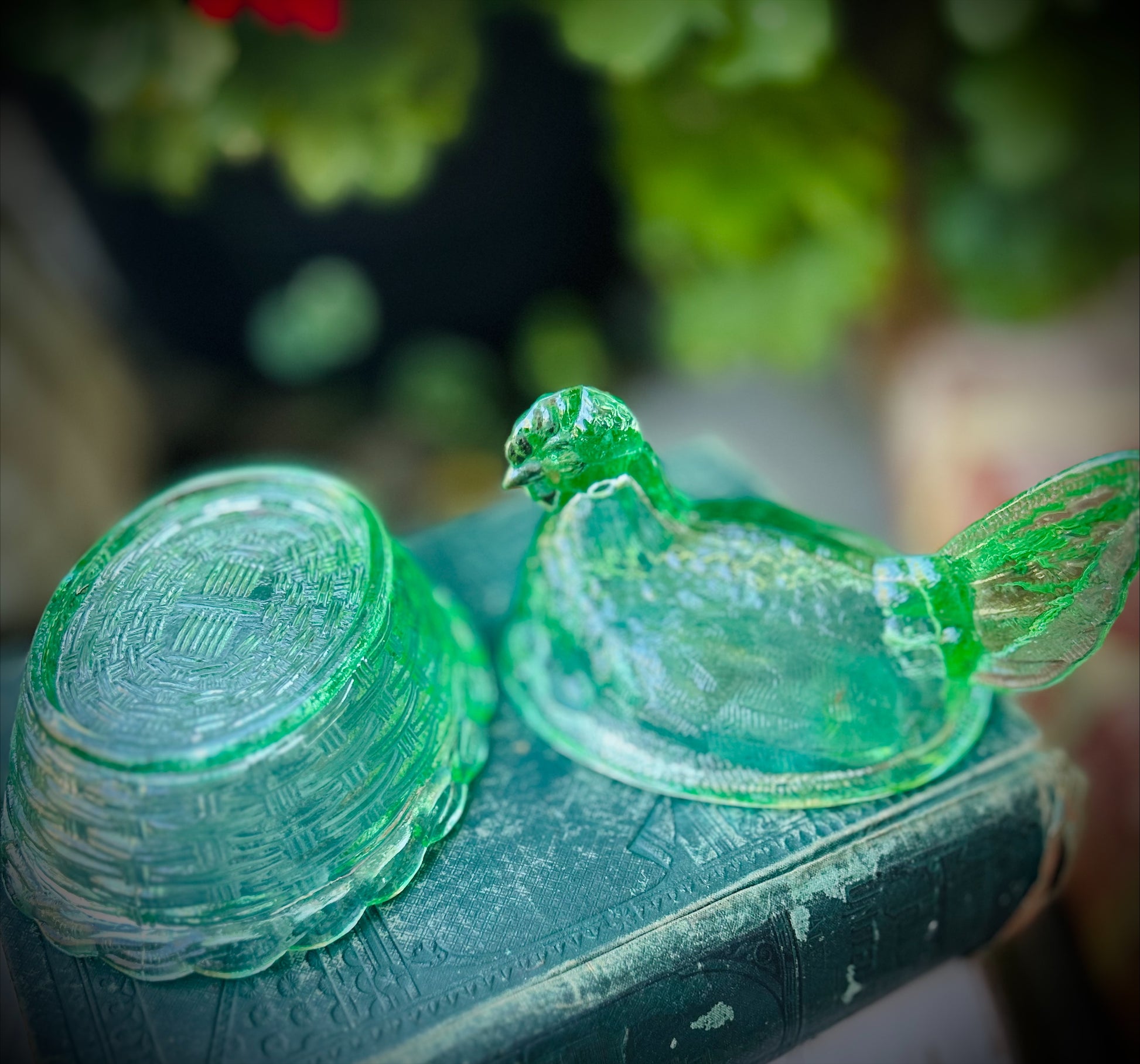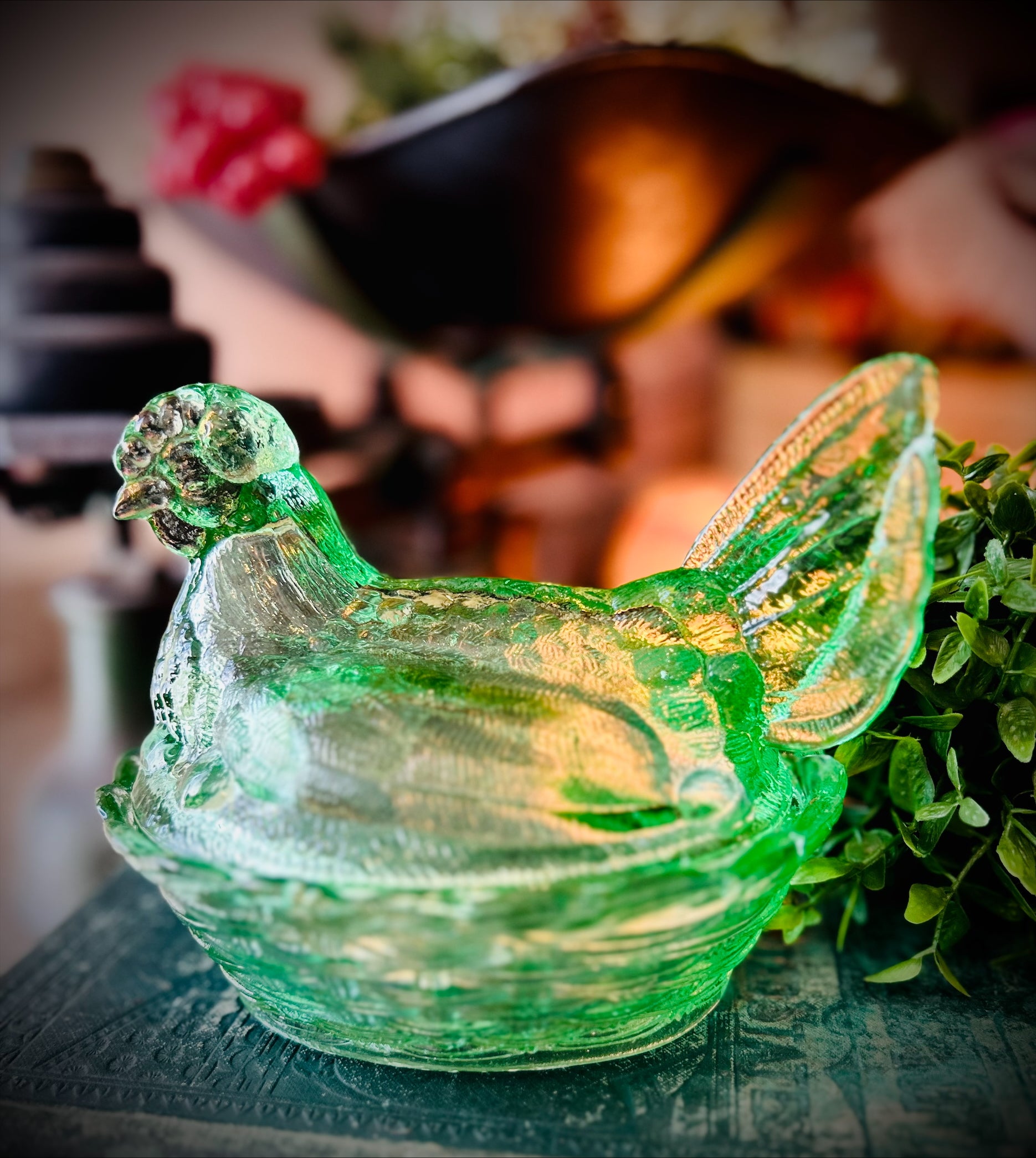 This distinctive pressed glass vessel showcases the refined craftsmanship of vintage American glassware. Crafted in a striking green tone with meticulously rendered feather work, the hen-shaped lidded container exemplifies early 20th-century design sensibilities. The functional cover makes it well-suited for storing confections, keepsakes, or decorative objects while maintaining its role as a sculptural accent piece. Measuring 5 inches in height and extending 6½ inches across the tail, it commands presence on shelves, within display cases, or as part of curated table arrangements. Its sophisticated vintage aesthetic and rich coloring introduce historical depth and understated elegance to traditional or eclectic interiors.