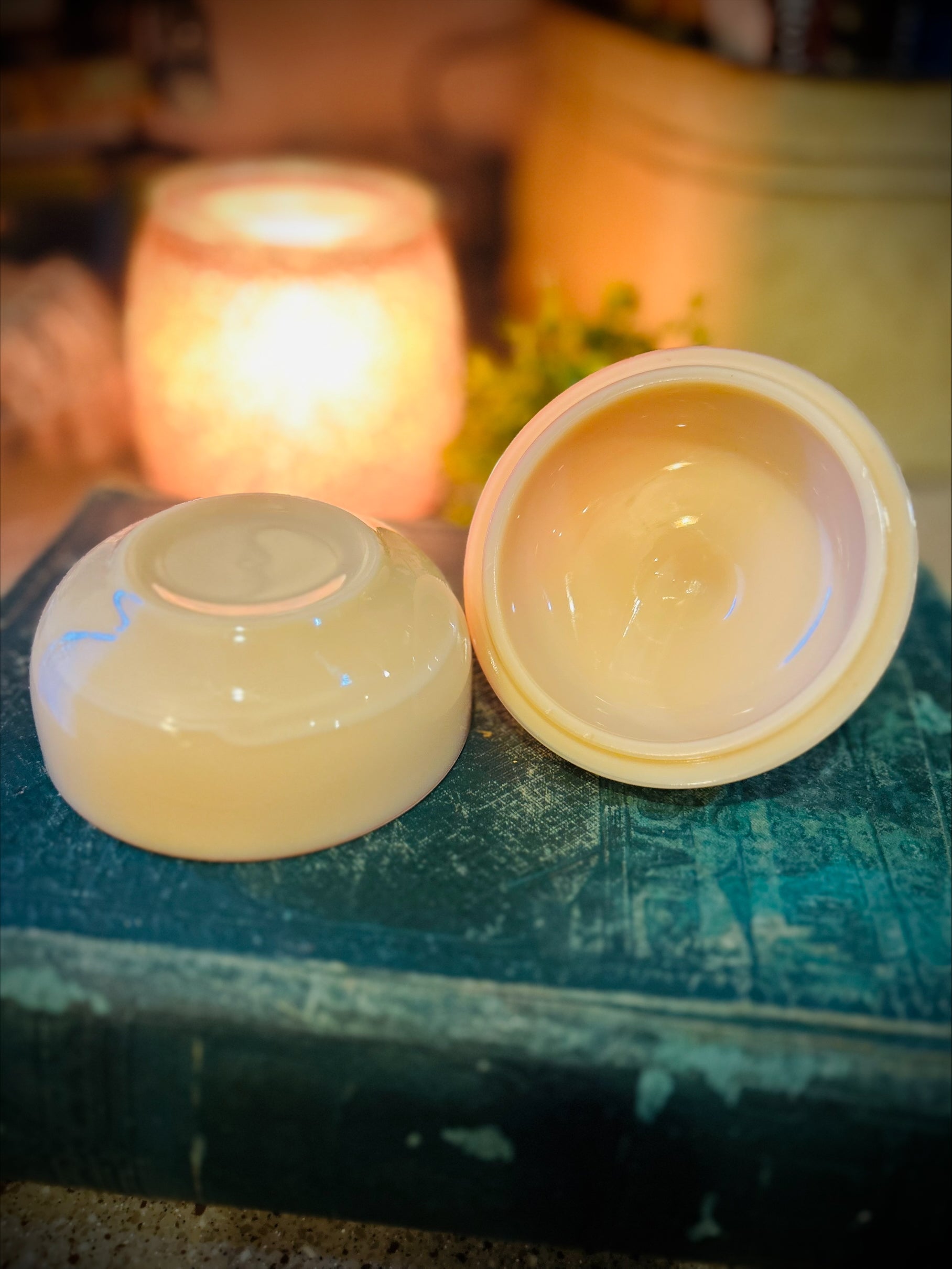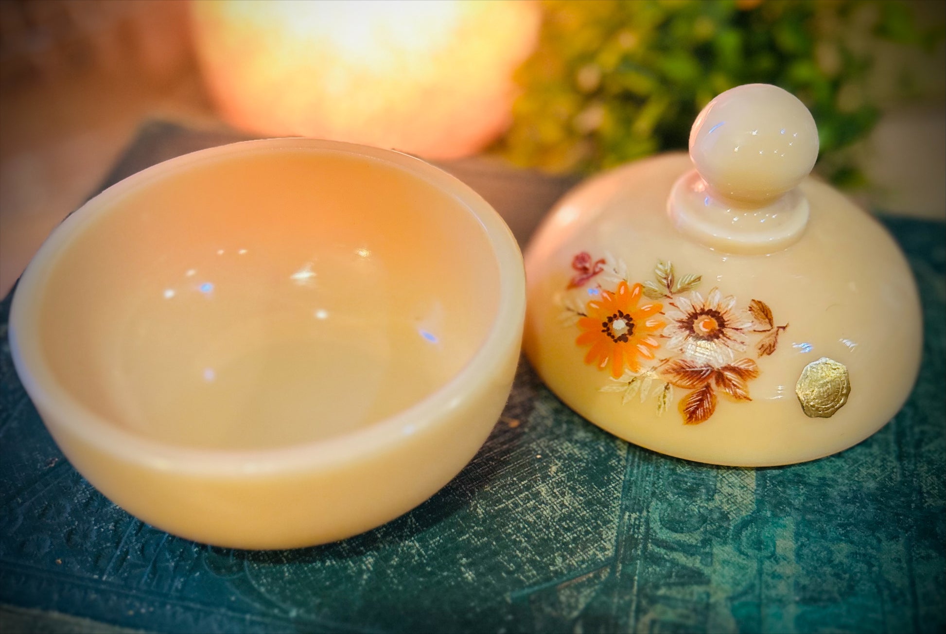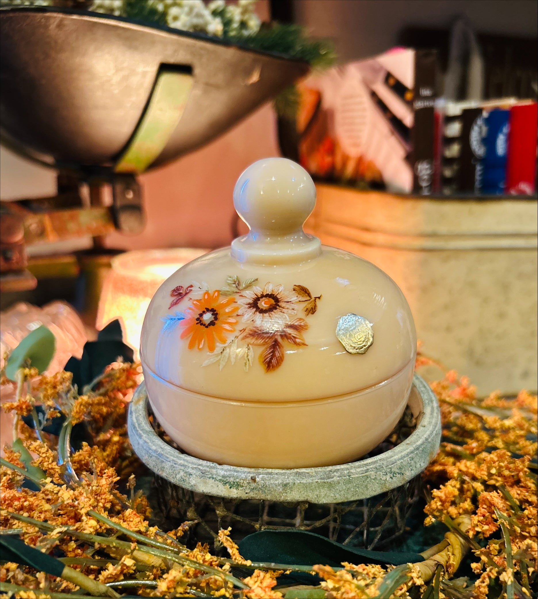 This charming Westmoreland Glass Company trinket dish showcases the warm, creamy appeal of custard milk glass with its signature glossy finish. Hand-painted florals in rich orange and brown hues adorn the rounded, lidded form—a practical vessel for jewelry, accessories, or sentimental treasures. Measuring 4 inches tall by 3¾ inches wide, it exemplifies mid-century American glassmaking at its finest. A sought-after piece among collectors, this custard glass treasure brings authentic vintage character to cottagecore, farmhouse, and shabby chic interiors. Includes original manufacturer sticker.
